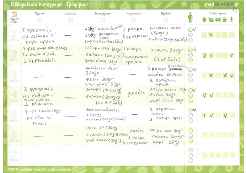 Εντάξει, αν δεν μπορούμε να τη διαβάσουμε της/του λέμε ευγενικά να μας την εξηγήσει. Μπορούμε πάντα να έχουμε κατά νου, ότι αν ο πελάτης θέλει πραγματικά να κρατήσει εβδομαδιαία καταγραφή, υπάρχουν και εναλλακτικές – να καταγράφει τι τρώει στο κινητό ή το tablet του για παράδειγμα.
