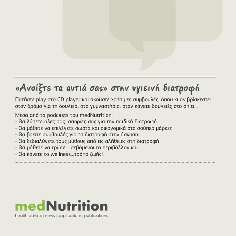 Αν ενδιαφέρεσαι να μάθεις πειρισσότερα για τη διατροφή σου, αλλά δεν έχεις χρόνο για διάβασμα, τότε το CD του medNutrition "Ανοίξτε τα αυτιά σας στην υγιεινή διατροφή" είναι αυτό που χρειάζεσαι.