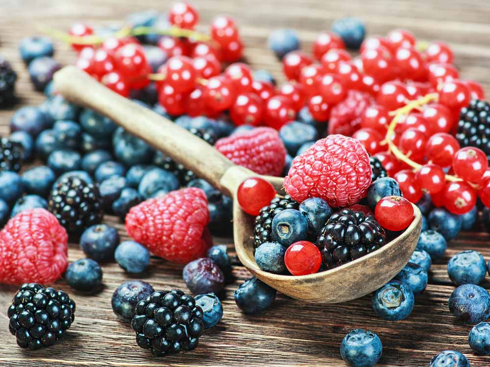 - Βαθύ κόκκινο χρώμα (λυκοπένιο, πολυφαινόλες): κεράσια, κόκκινα μήλα, φράουλες, καρπούζι και ρόδι.
