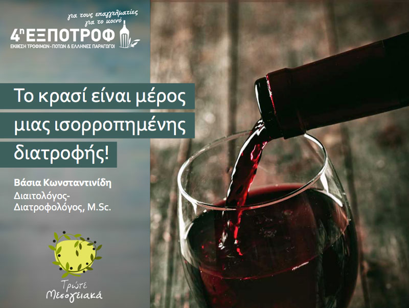 Κατά τη διάρκεια της 4ης έκθεσης τροφίμων και ποτών ΕΞΠΟΤΡΟΦ, που πραγματοποιήθηκε στην Αθήνα στις 27-30 Ιανουαρίου 2017, μου δόθηκε η ευκαιρία να παρουσιάσω τα συστατικά του κρασιού με στόχο την ανάδειξη της διατροφικής του αξίας, ως μέρος της Μεσογειακής διατροφής.