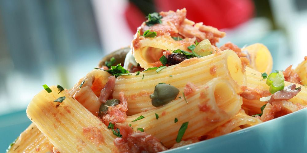 Η συνταγή λοιπόν, αποτελεί ένα ισορροπημένο και ολοκληρωμένο πιάτο. Θέλετε να μάθετε και μία πολύ σημαντική πληροφορία; Ο συνδυασμός υδατάνθρακα, πρωτεΐνης και κάποιου φρέσκου τροφίμου, όπως εδώ η ντομάτα, η κάππαρη, τα μυρωδικά, οι ελιές και οι σταφίδες, έχει σαν αποτέλεσμα να αυξάνει η έκκριση των ορμονών που ελέγχουν τη καλή διάθεση!